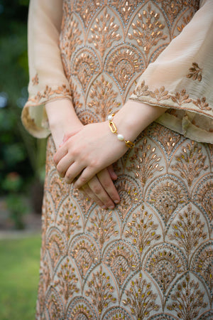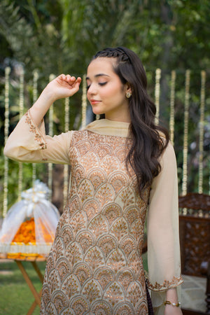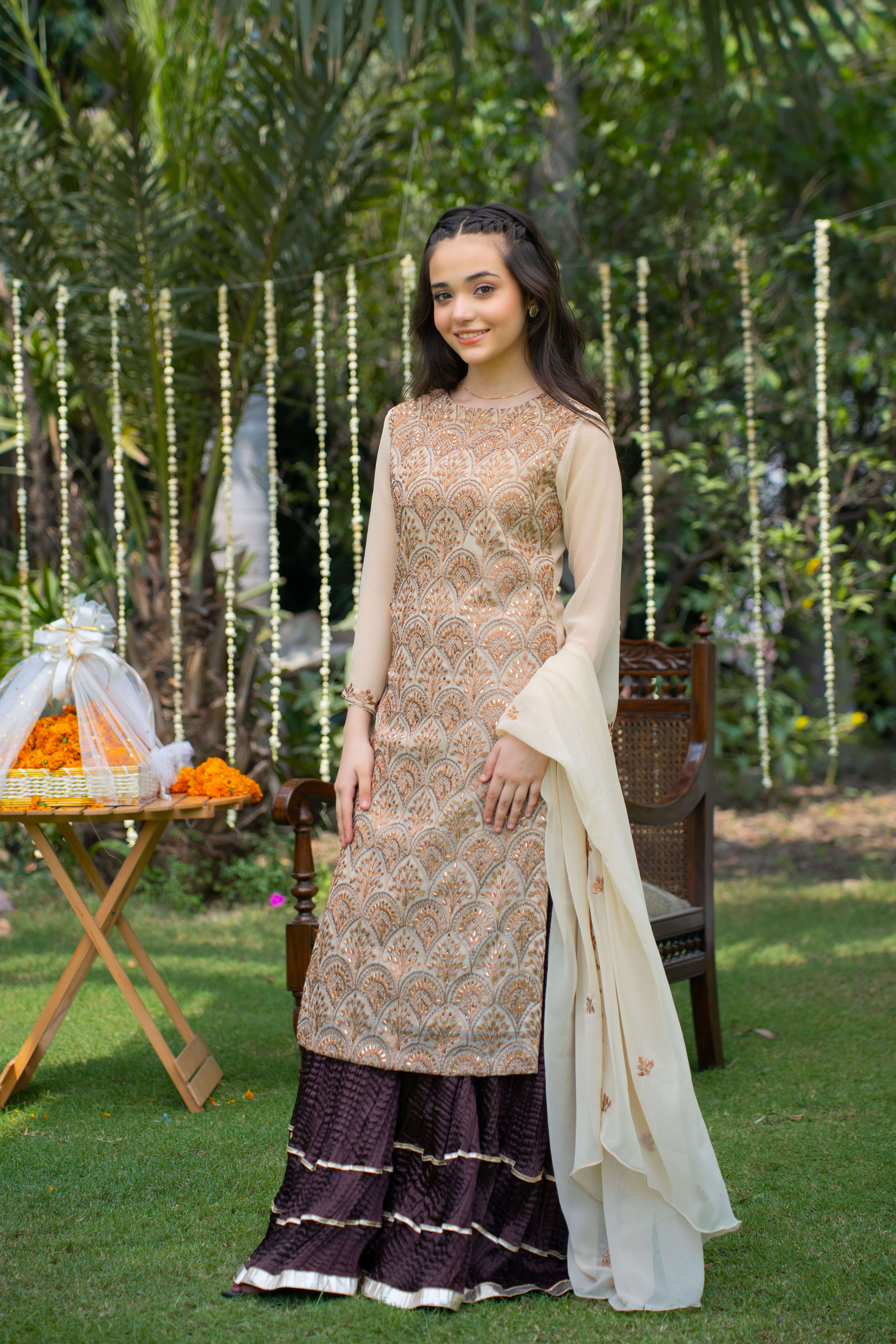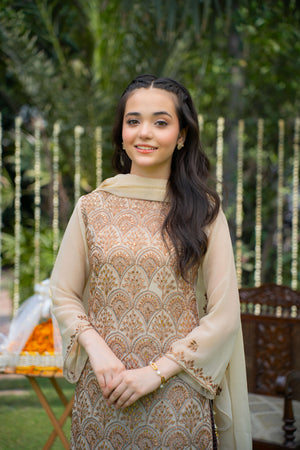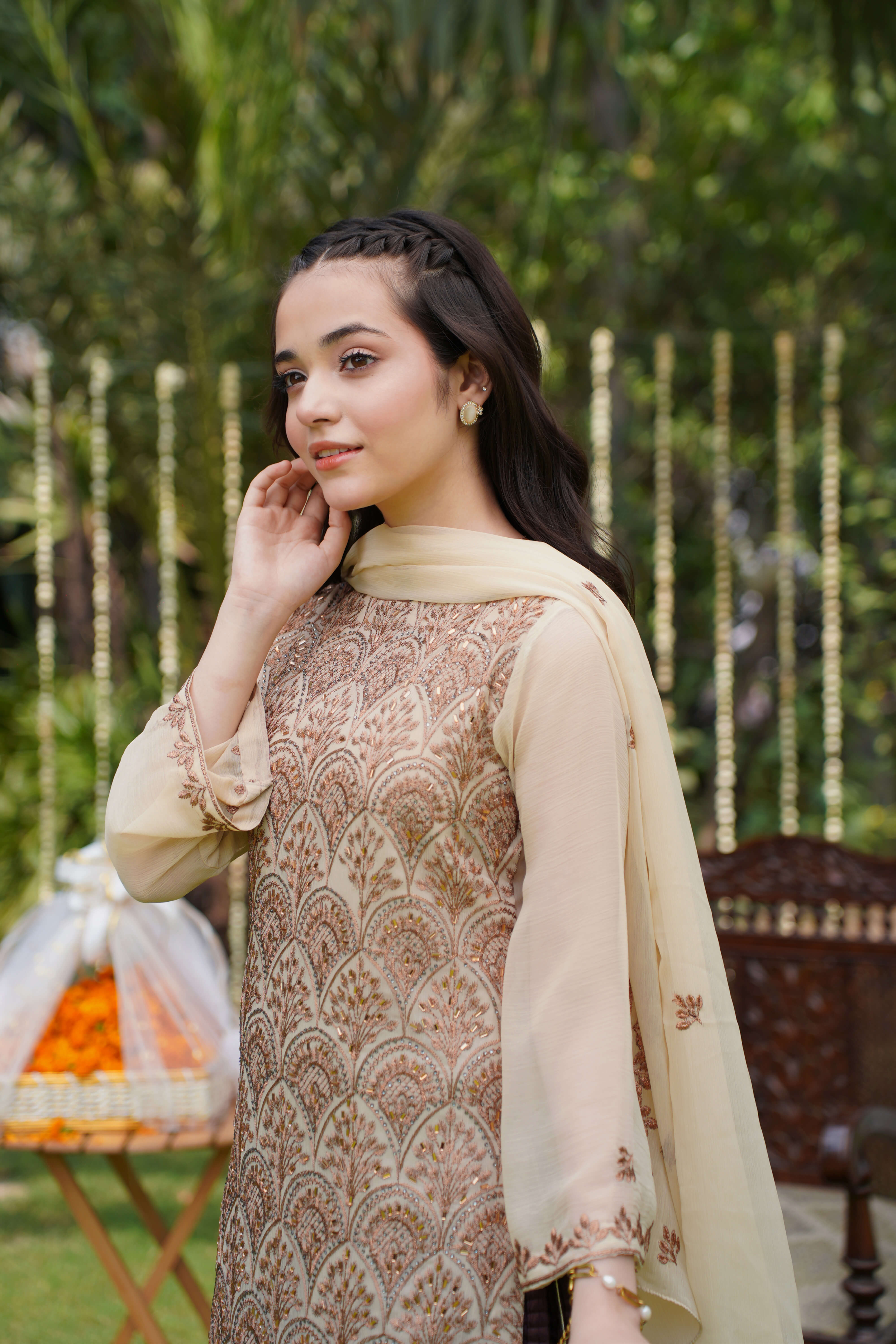 Zuleyha is a regal statement piece featuring a narrow long beige chiffon shirt adorned with heavy champagne cut daana embroidery. It is beautifully paired with a chocolate brown crushed sharara detailed with layered gold lace, creating a rich, textured look. A matching beige chiffon dupatta with delicate embroidery on the borders completes this elegant and luxurious festive ensemble.