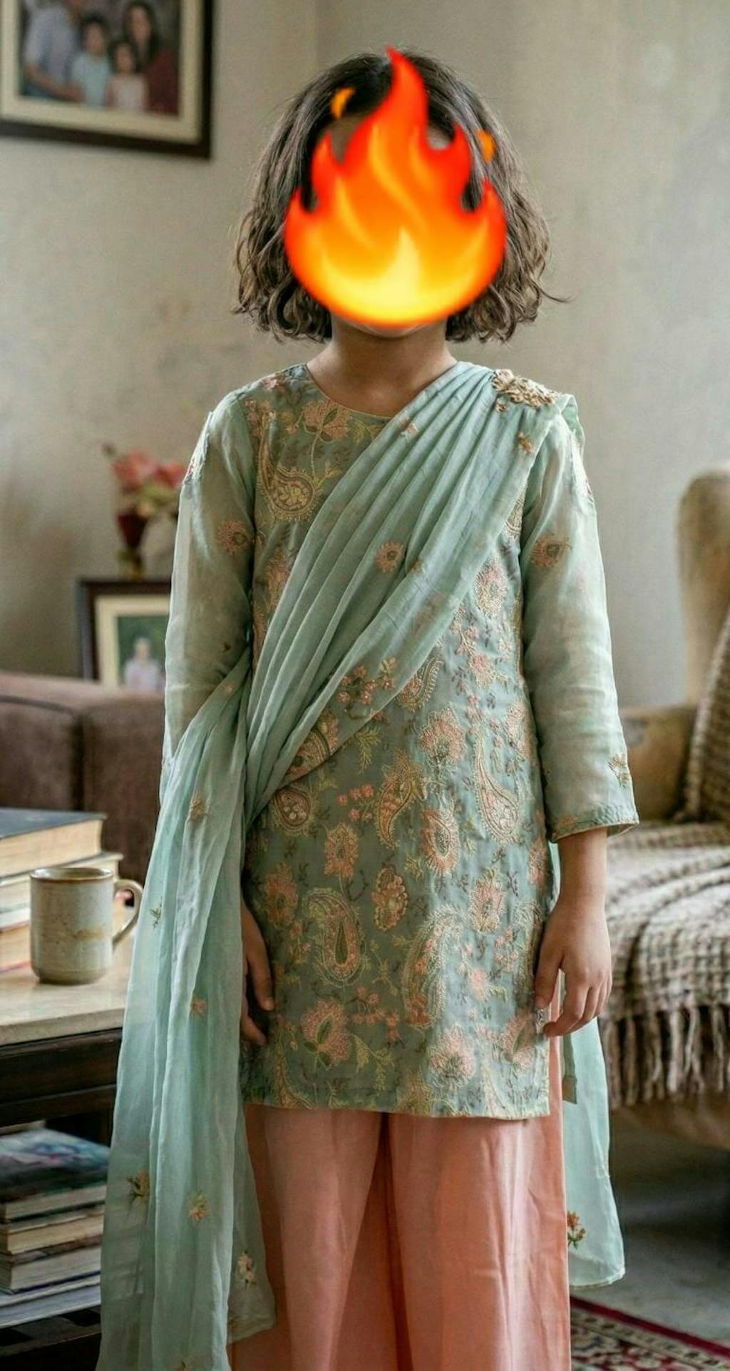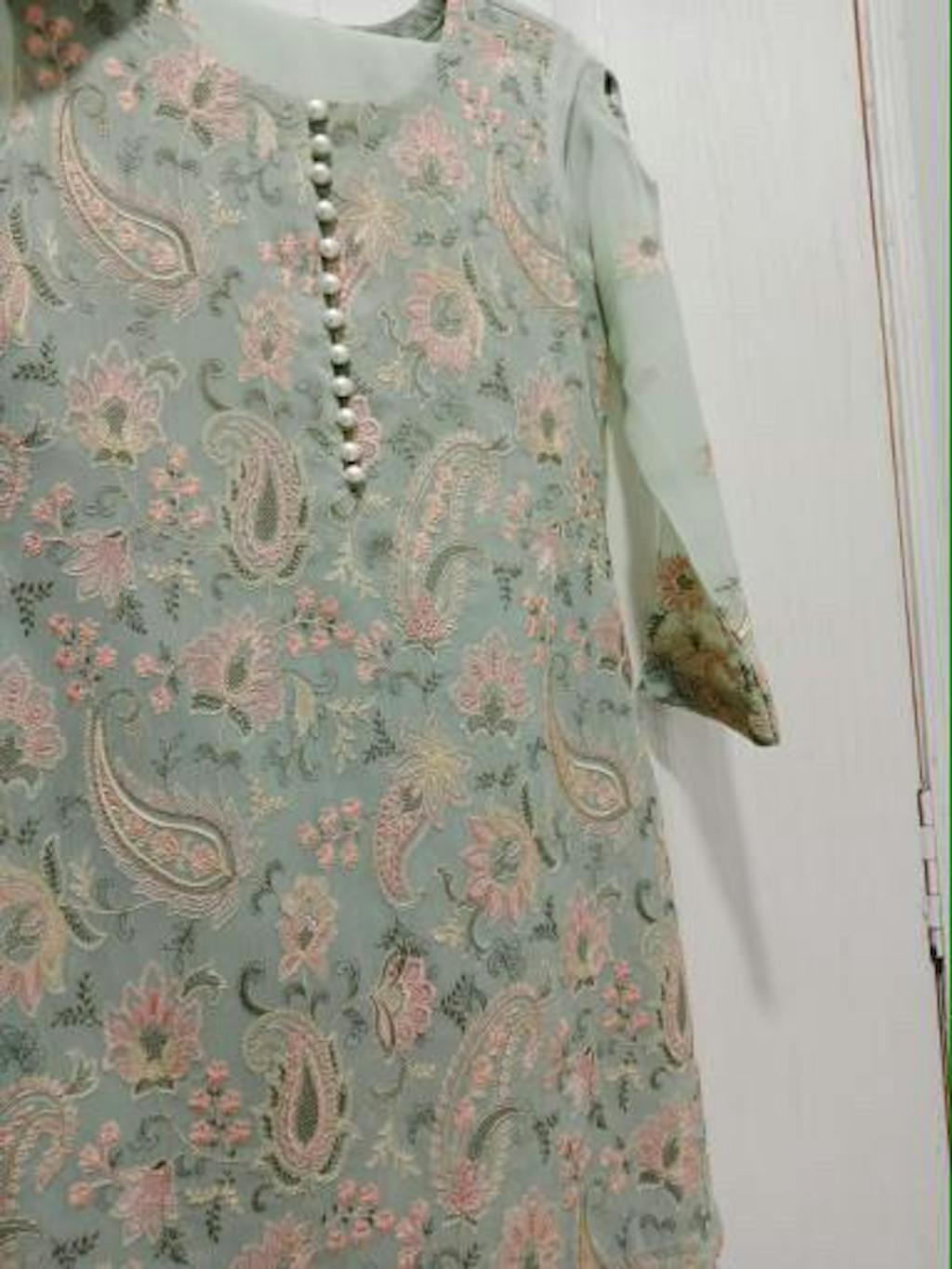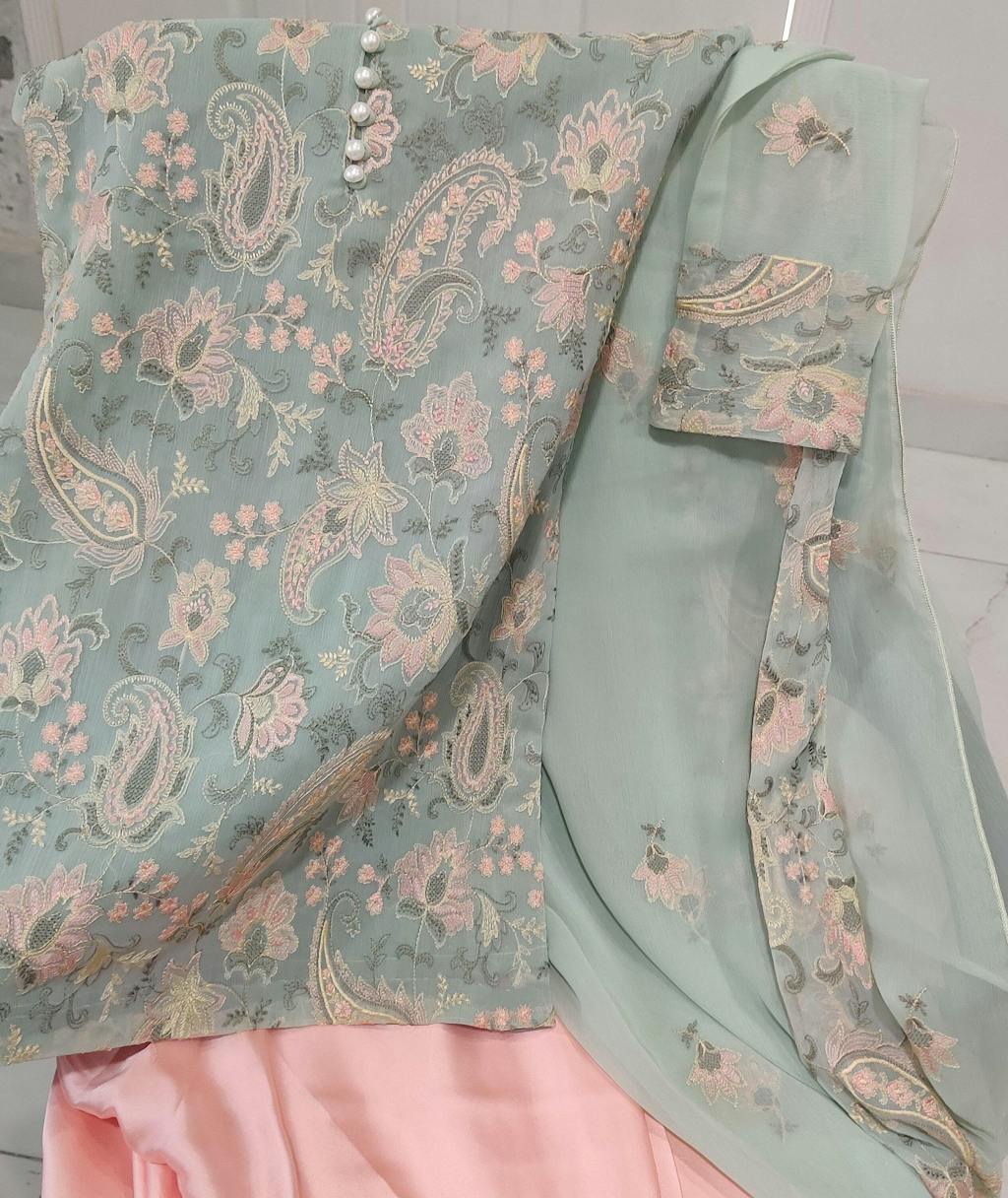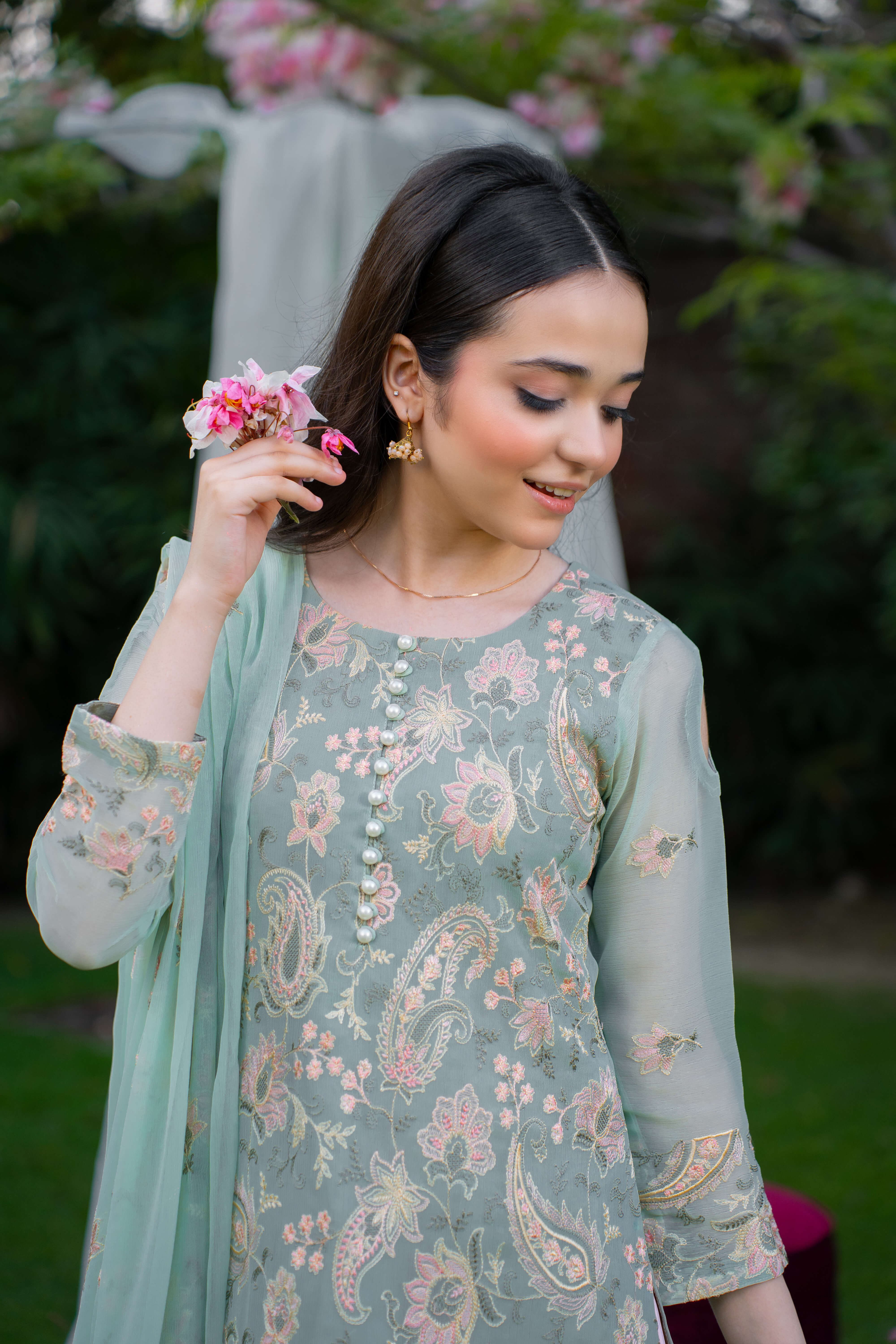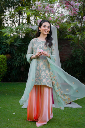 Zümrüt is a graceful blend of elegance and color harmony, featuring a sage green chiffon kurti adorned with delicate pink floral embroidery throughout, giving it a timeless and regal appeal. It is paired with a matching pink silk sharara boasting a grand flare, and a sage green chiffon dupatta highlighted with fine pink embroidery along the borders. An ideal pick for day events, weddings, or festive gatherings.